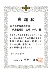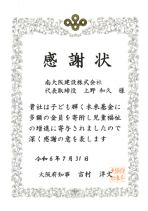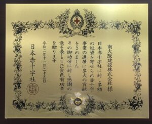 南大阪建設では、大阪府や日本赤十字社が実施している社会活動、慈善活動に対して寄付・援助を行い、より良い社会を目指す活動を応援しています。