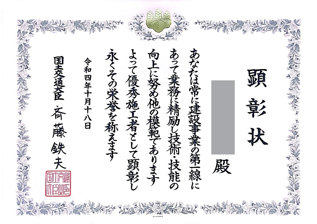 – 建設マスター表彰状 –