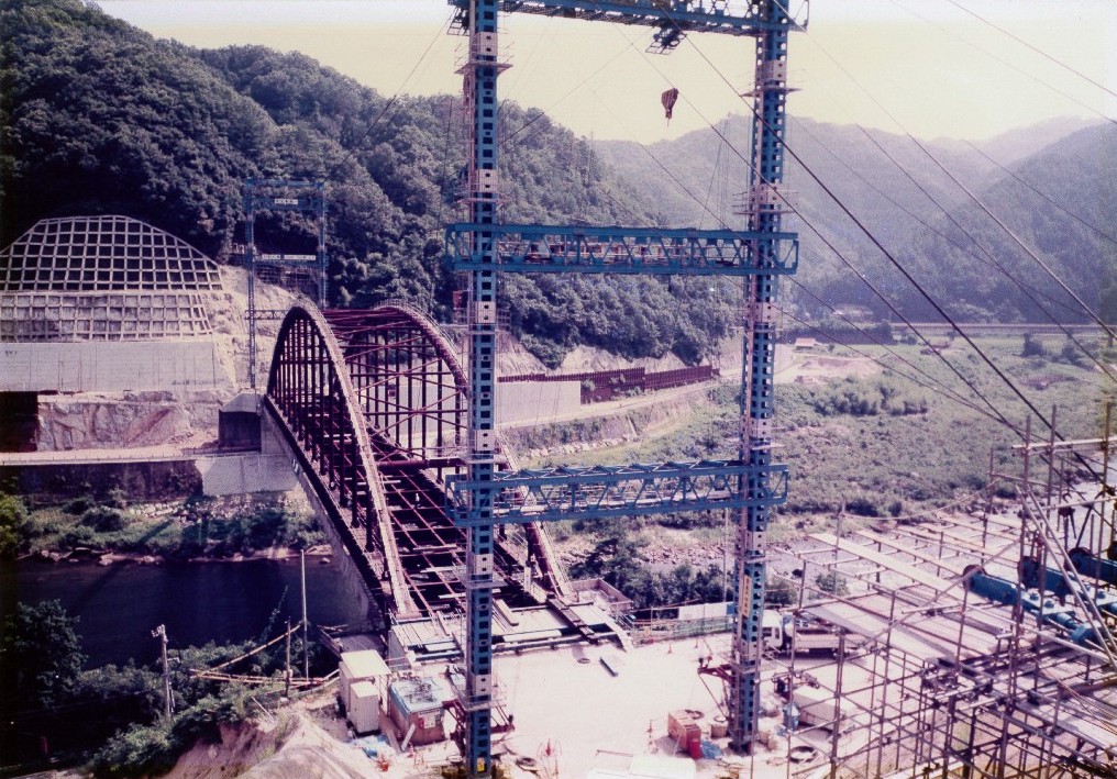 直径1.2mのアーチ部材を用いた、耐候性橋梁の架設工事です。